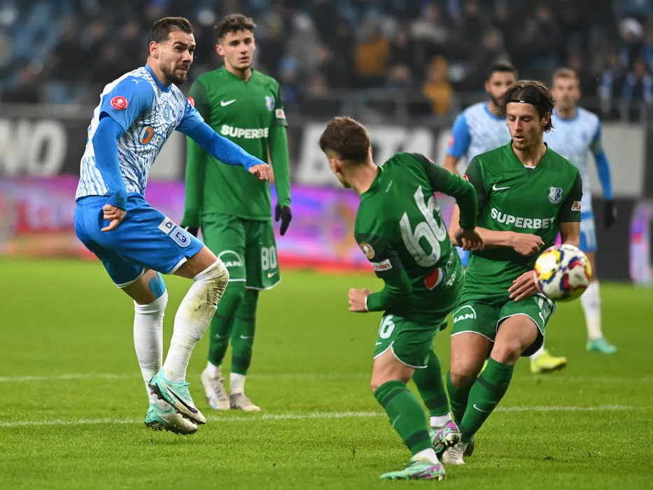 Elvir Koljic si Gabriel Leonard Danuleasa in meciul de fotbal dintre Universitatea Craiova si Farul Constanta, contand pentru Cupa Romaniei Betano, desfasurat pe Stadionul Ion Oblemenco din Craiova, marti 5 decembrie 2023. © FOTO:Razvan Pasarica/SPORT PICTURES