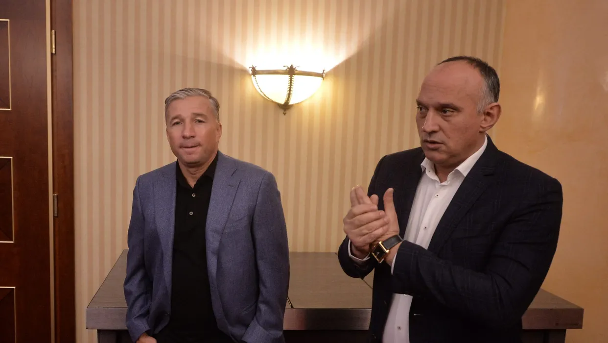 Dan Petrescu (S) si Florin Prunea (D) participa la o conferinta de presa sustinuta de Ionut Lupescu (nu este in imagine) care isi lanseaza oficial candidatura la presedintia Federatiei Romane de Fotbal (FRF), luni, 26 februarie 2018, in Bucuresti. ALEXANDRU DOBRE / MEDIAFAX FOTO