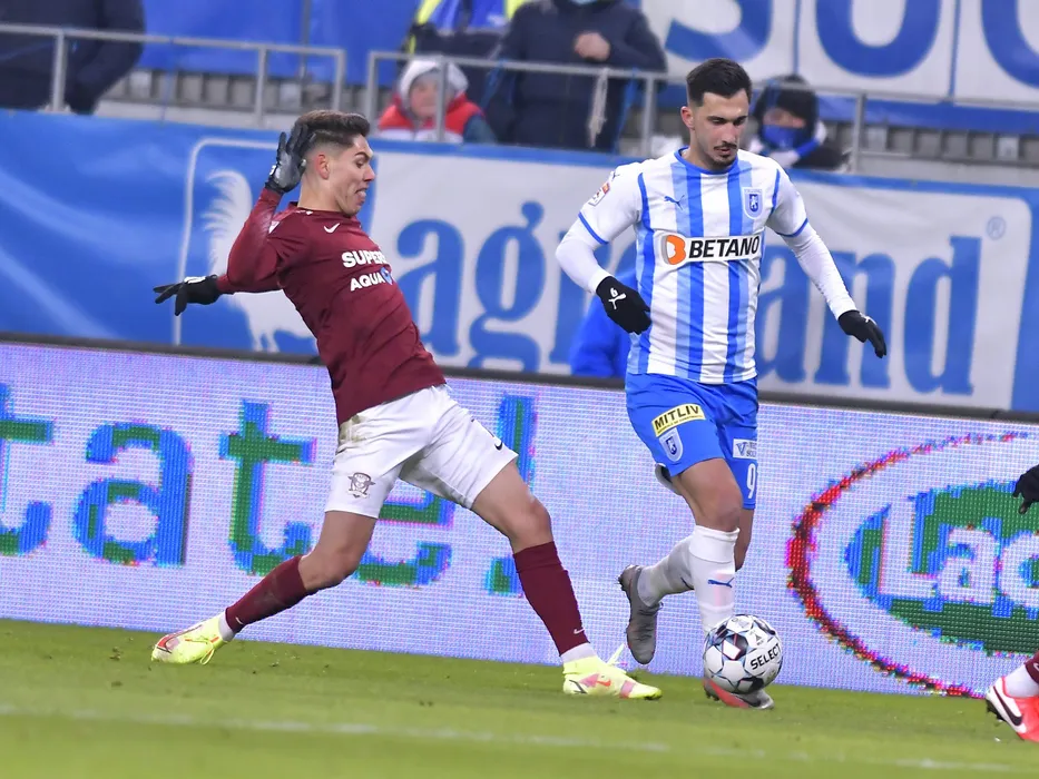 Rares Andrei Ilie si Andrei Virgil Ivan in meciul de fotbal dintre Universitatea Craiova si Rapid Bucuresti, contand pentru Liga 1 Casa Pariurilor, desfasurat pe Stadionul Ion Oblemenco din Craiova, sambata 22 ianuarie 2022. © FOTO:Razvan Pasarica/SPORT PICTURES