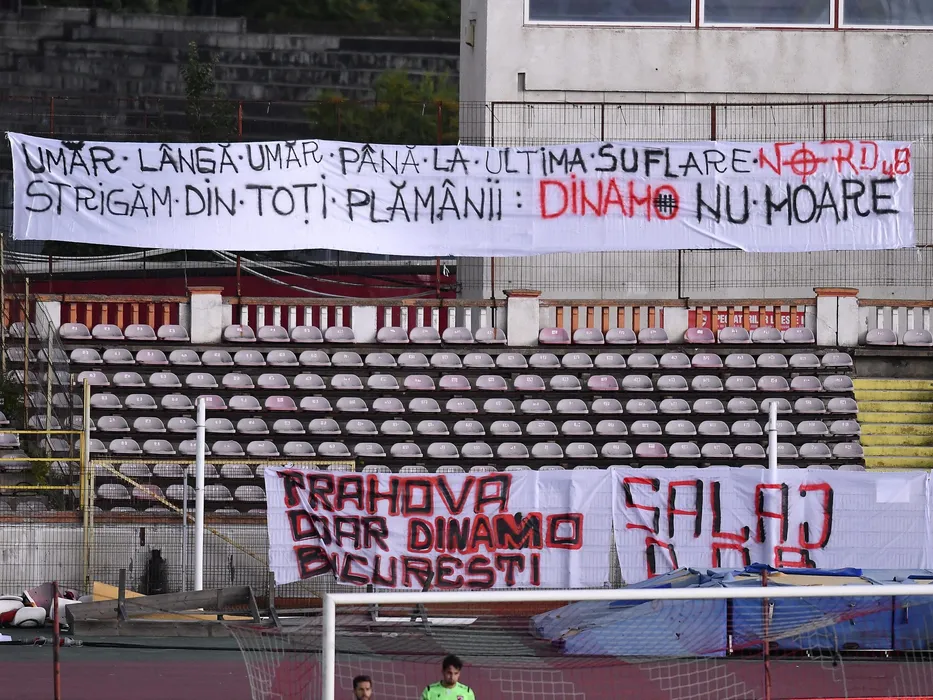 Banere ale suporterilor dinamovisti in meciul de fotbal dintre Dinamo Bucuresti si Sepsi OSK Sfantu Gheorghe, contand pentru play-out-ul Ligii 1 Casa Pariurilor, disputat fara spectatori pe Stadionul Dinamo din Bucuresti, duminica 21 iunie 2020. © FOTO:Razvan Pasarica/SPORT PICTURES