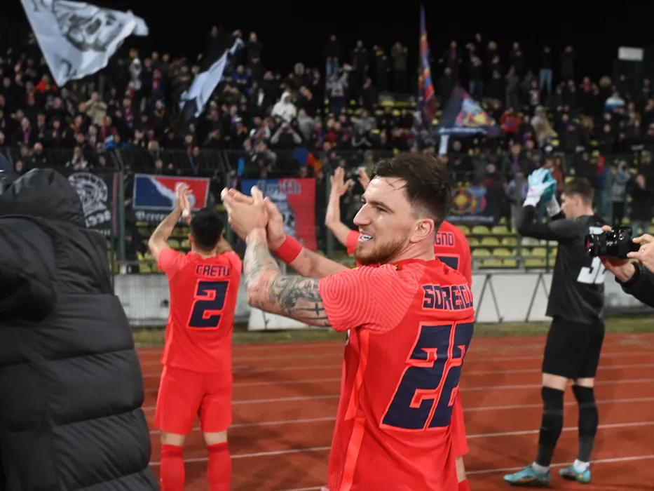 Fotbalistii stelisti printre care Deian Cristian Sorescu saluta galeria dupa meciul de fotbal dintre FC Arges si FCSB, contand pentru Superliga Superbet, desfasurat pe Stadionul Nicolae Dobrin din Pitesti, duminica 26 februarie 2023. © FOTO:Razvan Pasarica/SPORT PICTURES