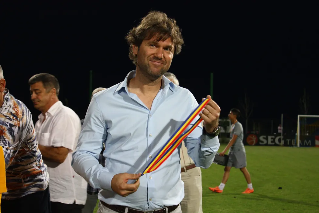 Florin Raducioiu, antrenorul lotului national de fotbal Under 15, ofera medalii jucatorilor echipei de fotbal Viitorul Constanta, pentru castigarea campionatului la nivel de juniori, la finalul meciului cu Steaua Bucuresti, disputat in Buftea, sambata, 29 iunie 2013. GABRIEL FLUERARIU / MEDIAFAX FOTO