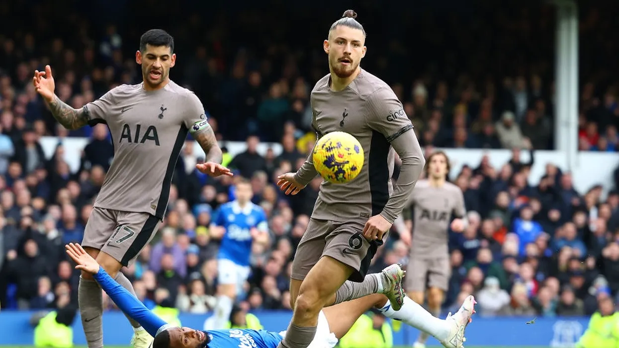 LIVERPOOL, ENGLAND - FEBRUARY 03: Beto of Everton is fouled by Radu Dragusin of Tottenham Hotspur during the Premier League match between Everton FC and Tottenham Hotspur at Goodison Park on February 03, 2024 in Liverpool, England. (Photo by Chris Brunskill/Fantasista/Getty Images)
