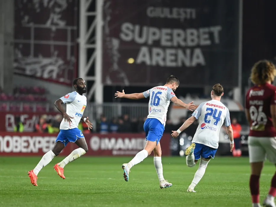 Dragos Ionut Nedelcu se bucura dupa un gol marcat alaturi de Kevin Gnoher Boli in meciul de fotbal dintre Rapid Bucuresti si Farul Constanta, contand pentru Play-off-ul Superligii Superbet, desfasurat pe Stadionul Rapid Giulesti din Bucuresti, sambata 1 aprilie 2023. © FOTO:Razvan Pasarica/SPORT PICTURES