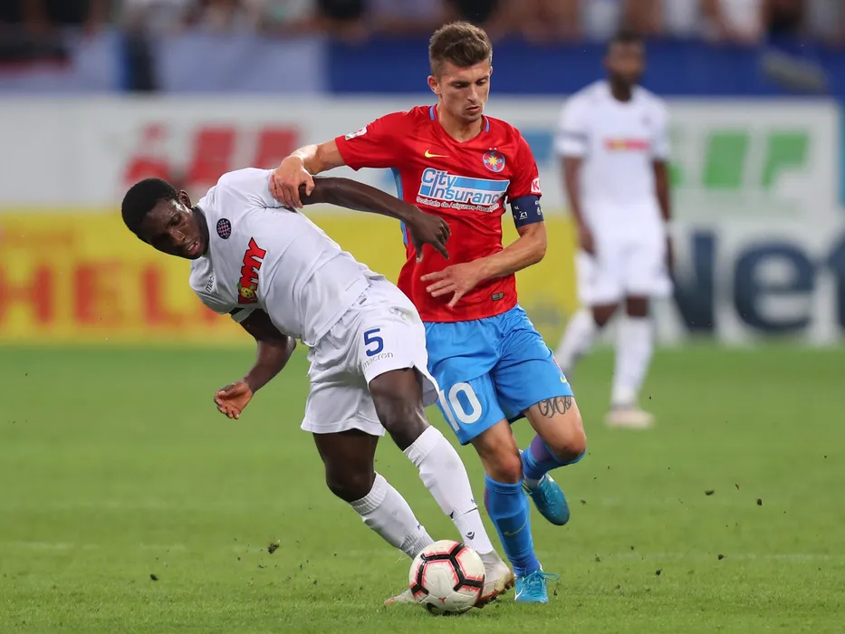 Hamza Barry (S) si Florin Tanase (D) lupta pentru balon in meciul de fotbal dintre FC Steaua Bucuresti si Hajduk Split, din mansa secunda a turului trei preliminar al Ligii Europa, disputat pe Arena Nationala din Bucuresti, joi, 16 august 2018.© FOTO: Stefan Constantin / Sport Pictures