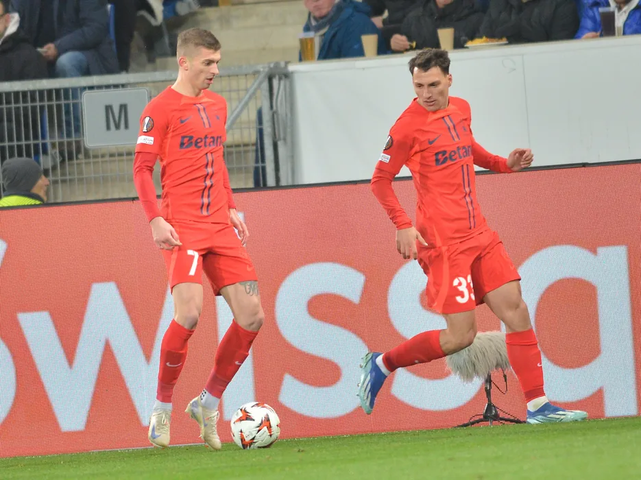 Florin Lucian Tănase și Risto Radunovic în meciul de fotbal dintre Hoffenheim și FCSB, contând pentru UEFA Europa League, desfășurat pe Stadionul Rhein-Neckar-Arena din Sinsheim, joi 12 decembrie 2024. © FOTO: Alexandra Cristina GRIGORESCU/SPORT PICTURES