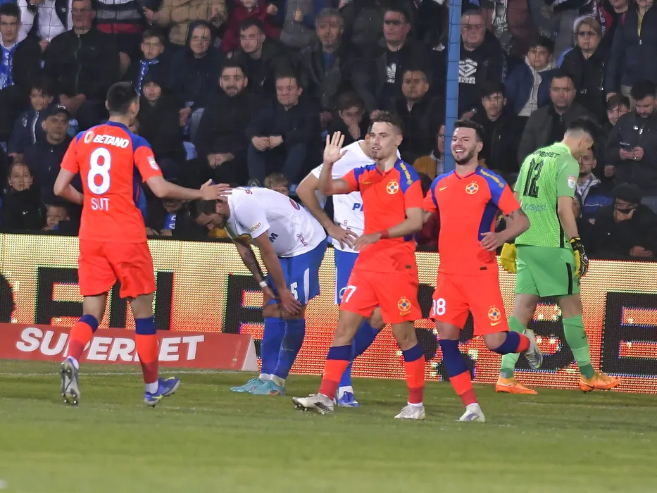 Darius Dumitru Olaru se bucura dupa un gol marcat alaturi de Andrei Ioan Cordea in meciul de fotbal dintre Farul Constanta si FCSB, contand pentru Play off-ul Ligii 1 Casa Pariurilor, desfasurat pe Stadionul central al Academiei Gheorghe Hagi din Ovidiu, luni 25 aprilie 2022. © FOTO:Razvan Pasarica/SPORT PICTURES