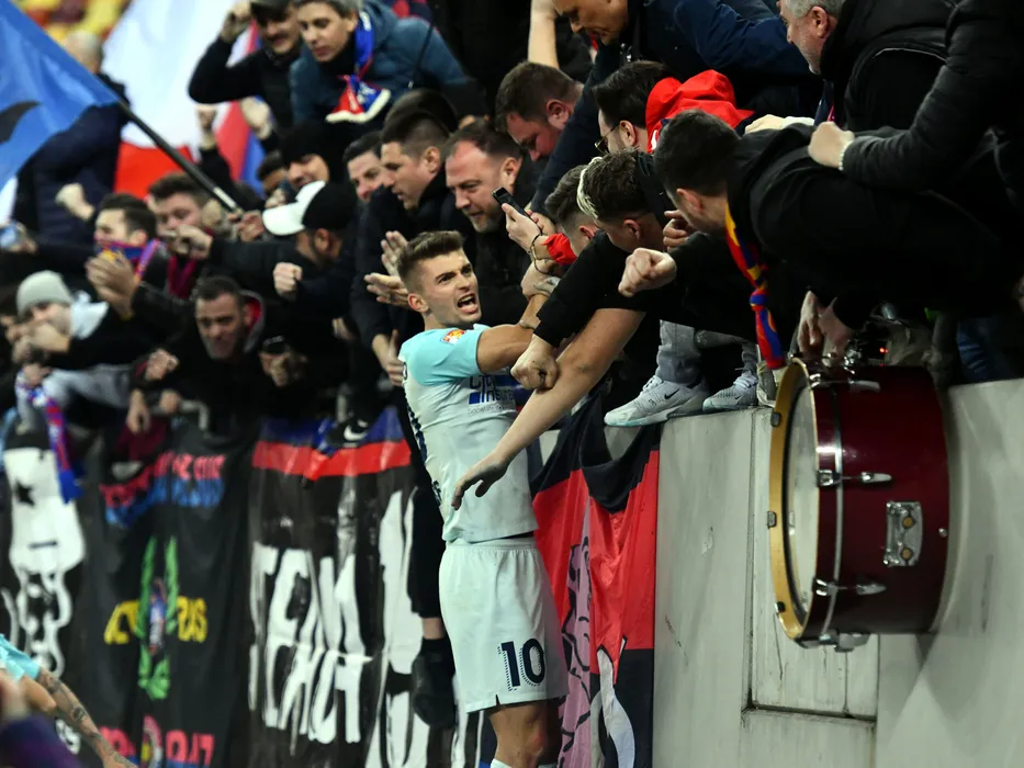 Florin Tanase se bucura alaturi de galerie dupa meciul de fotbal dintre Dinamo Bucuresti si FCSB, contand pentru Liga 1 Casa Pariurilor, disputat pe Arena Nationala din Bucuresti, duminica 16 februarie 2019. © FOTO:Razvan Pasarica/SPORT PICTURES