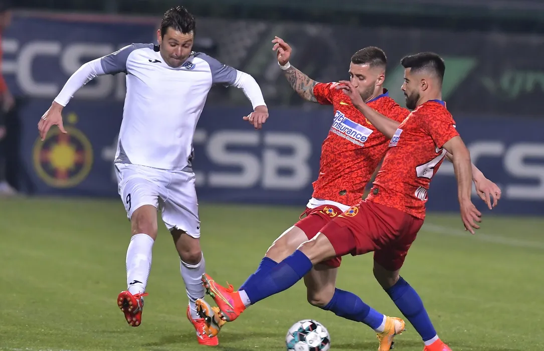 Raul Andrei Rusescu, Ovidiu Marian Popescu si Ionut Daniel Vina in meciul de fotbal dintre FCSB si Academica Clinceni, contand pentru Play-off-ul Ligii 1 Casa Pariurilor, desfasurat fara spectatori pe Stadionul Marin Anastasovici din Giurgiu, luni 10 mai 2021. © FOTO:Razvan Pasarica/SPORT PICTURES