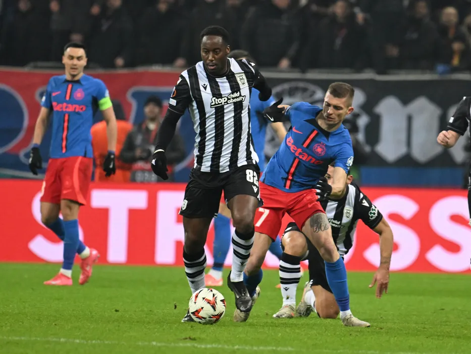 Soualiho Meite si Florin Lucian Tănase in meciul de fotbal dintre FCSB si PAOK Salonic, din cadrul UEFA Europa League, desfasurat pe Arena Nationala din Bucuresti, joi 20 februarie 2025. © FOTO:Razvan Pasarica/SPORT PICTURES