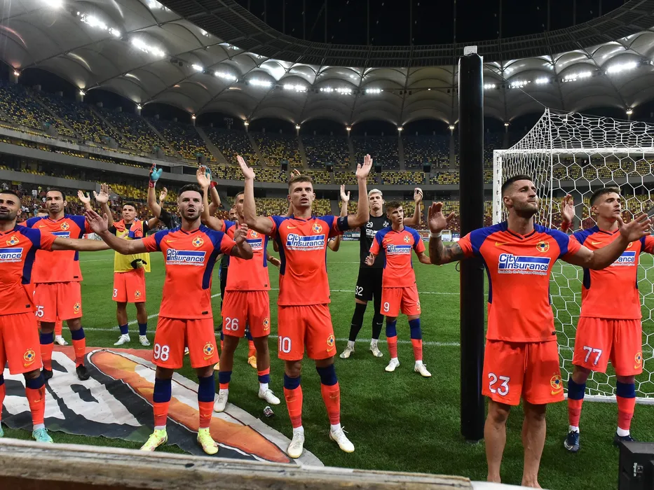 Fotbalistii stelisti Andrei Ioan Cordea, Florin Lucian Tanase, Ovidiu Marian Popescu si Sorin Danut Serban saluta galeria dupa meciul de fotbal dintre FCSB si Gaz Metan Medias, contand pentru Liga 1 Casa Pariurilor, desfasurat pe Arena Nationala din Bucuresti, duminica 8 august 2021. © FOTO:Razvan Pasarica/SPORT PICTURES