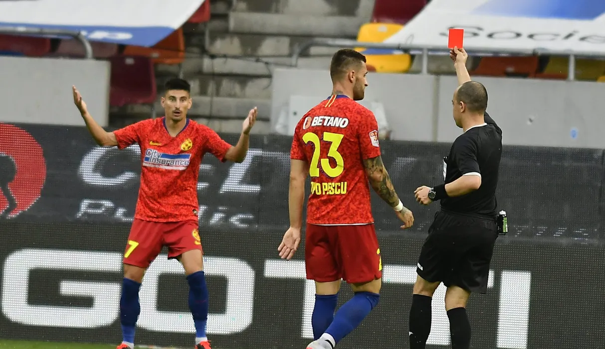 Marius Avram ii acorda cartonasul rosu lui Lucian Iulian Cristea in meciul de fotbal dintre FCSB si FC Botosani, contand pentru play-off-ul Ligii 1 Casa Pariurilor, disputat fara spectatori pe Arena Nationala din Bucuresti, sambata 4 iulie 2020. © FOTO:Razvan Pasarica/SPORT PICTURES