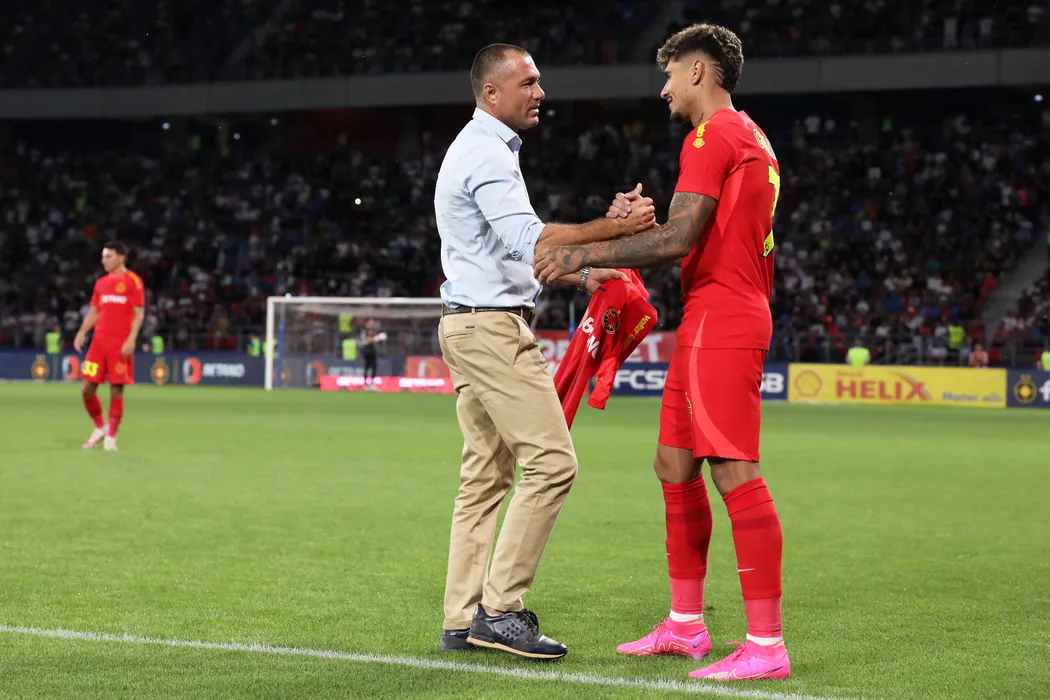 Florinel Teodor Coman ii ofera un tricou lui Adrian Ilie inaintea meciului de fotbal dintre FCSB si CFR Cluj, din cadrul Superligii Superbet, desfasurat pe Stadionul Steaua-Ghencea din Bucuresti, duminica 6 august 2023. © FOTO:Antonio Vasile/SPORT PICTURES