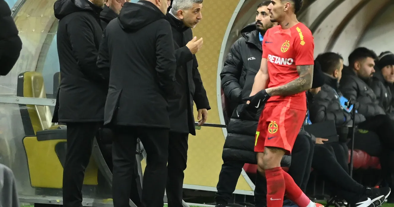 Florinel Teodor Coman paraseste terenul eliminat din meciul de fotbal dintre FCSB si Otelul Galati, din cadrul Superligii Superbet, desfasurat pe Arena Nationala din Bucuresti, duminica 3 decembrie 2023. © FOTO:Razvan Pasarica/SPORT PICTURES