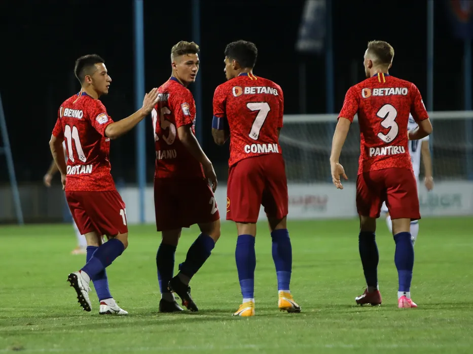 Olimpiu Vasile Morutan, Ovidiu Ioan Perianu si Florinel Teodor Coman se bucura dupa un gol reusit in meciul de fotbal dintre Backa Topola si FCSB, contand pentru Liga Europa, desfasurat fara spectatori pe Stadionul Gradski Senta din Senta, joi 17 septembrie 2020. © FOTO:Ciprian Petcut/SPORT PICTURES