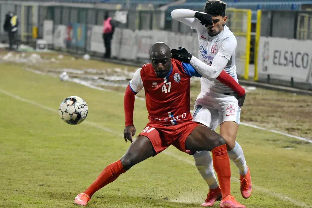 Christopher Braun (S), de la FC Botosani, lupta pentru balon cu Florinel Coman (D), de la FCSB, in meciul de fotbal din etapa a XXV-a a Ligii 1, disputat pe stadionul Municipal din Botosani, duminica, 28 februarie 2021. DRAGOS PASCANEANU / MEDIAFAX FOTO