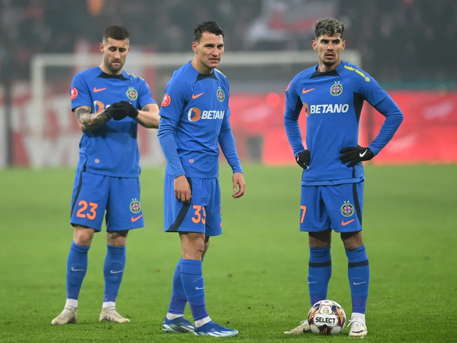 Fotbalistii stelisti Ovidiu Marian Popescu, Risto Radunovic si Florinel Teodor Coman inaintea executarii loviturii libere din care a marcat ultimul in meciul de fotbal dintre Dinamo Bucuresti si FCSB, din cadrul Superligii Superbet, desfasurat pe Arena Nationala din Bucuresti, duminica 26 noiembrie 2023. © FOTO:Razvan Pasarica/SPORT PICTURES