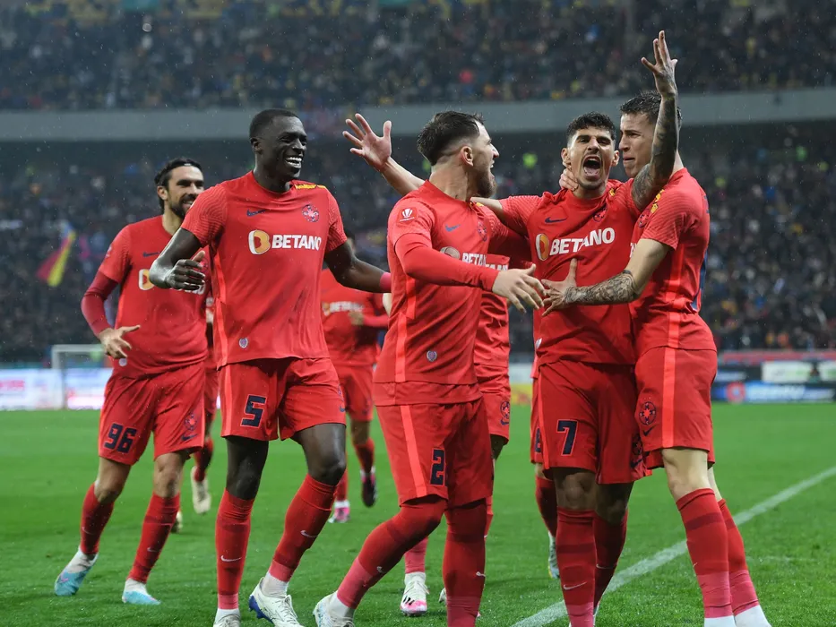 Bucurie a fotbalistilor stelisti dupa un gol marcat cu Joyskim Aurelien Dawa Tchakonte, Deian Cristian Sorescu, Florinel Teodor Coman si Octavian George Popescu in meciul de fotbal dintre FCSB si Farul Constanta, contand pentru Play-off-ul Superligii Superbet, desfasurat pe Arena Nationala din Bucuresti, luni 17 aprilie 2023. © FOTO:Razvan Pasarica/SPORT PICTURES