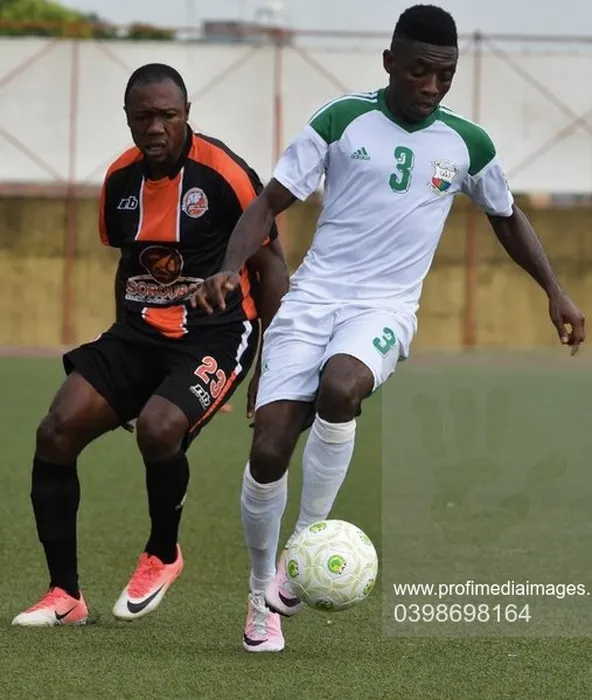 San Pedro's Ghanaian forward Manu Nana Antwi (L) vies with Armed Forces' Lasanna Jarju during the CAF Confederation Cup qualifying round football match between FC San Pedro and Gambia Armed Forces at the Robert Champroux stadium in Abidjan on November 27, 2018.,Imagine: 398698164, Licenta: Rights-managed, Restrictii: , Model Release: no