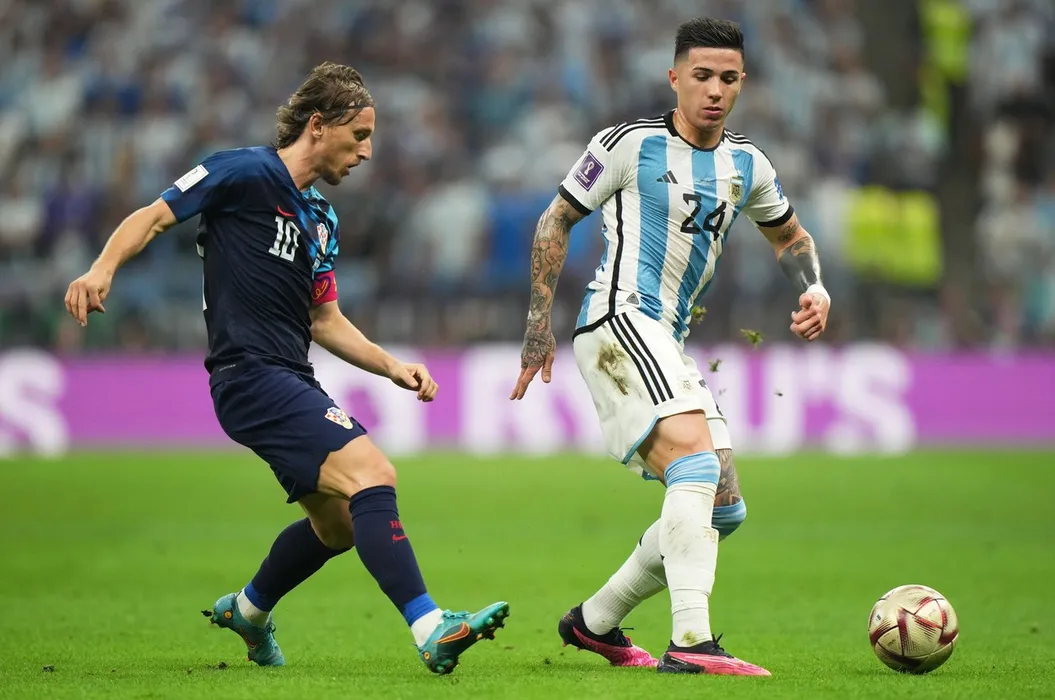 Enzo Fernandez of Argentina and Luka Modric of Croatia