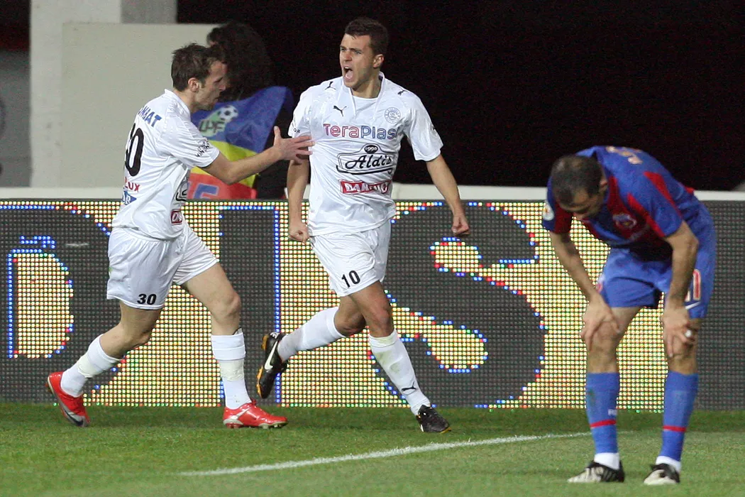 Liviu Bajenaru (S) si Aluisio Chaves Ribeiro Moraes Junior (C), de la Gloria Bistrita, se bucura dupa marcarea unui gol, in meciul cu Steaua Bucuresti, din cadrul etapei a XXVI-a a Ligii I la fotbal, la Bistrita, miercuri, 7 aprilie 2010. MIRCEA ROSCA / MEDIAFAX FOTO