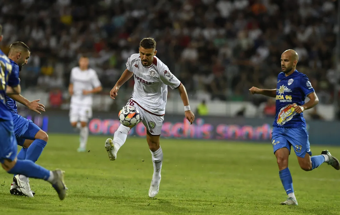 Răzvan Constantin Oaidă și Dario Canadija în meciul de fotbal dintre Gloria Buzău și FC Rapid 1923 București, contând pentru SuperLiga Superbet, desfășurat pe Stadionul Gloria din Buzău, sâmbătă 10 august 2024. © FOTO: Simion MECHNO/SPORT PICTURES