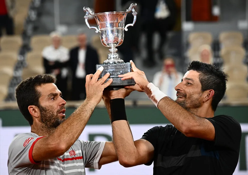 Salvador's Marcelo Arevalo (R) and Netherlands' Jean-julien Rojer (L) celebrate with their trophy after winning against Croatia's Ivan Dodig and Austin Krajicek of the US at the end of their men's doubles final match on day fourteen of the Roland-Garros Open tennis tournament at the Court Philippe-Chatrier in Paris on June 4, 2022.,Image: 696960479, License: Rights-managed, Restrictions: , Model Release: no, Credit line: Profimedia