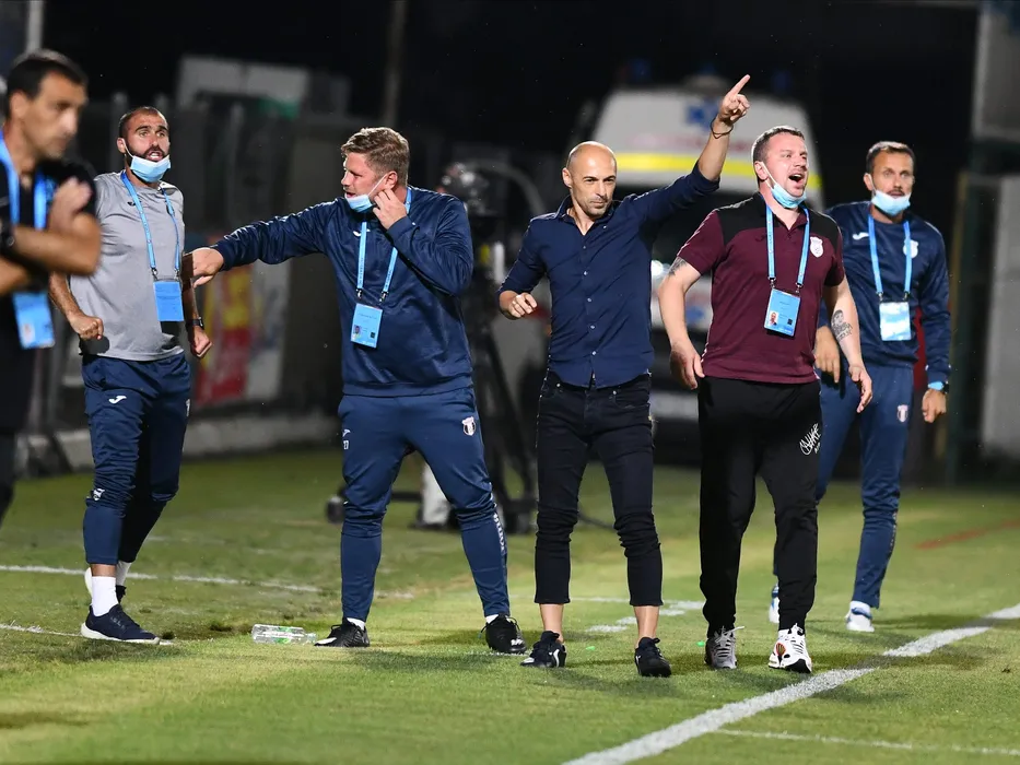 Banca tehnica a Astrei cu Vasile Maftei, Octavian Chihaia si Bogdan Andone in meciul de fotbal dintre Astra Giurgiu si FCSB, contand pentru play-off-ul Ligii 1 Casa Pariurilor, disputat fara spectatori pe Stadionul Marin Anastasovici din Giurgiu, luni 29 iunie 2020. © FOTO:Razvan Pasarica/SPORT PICTURES