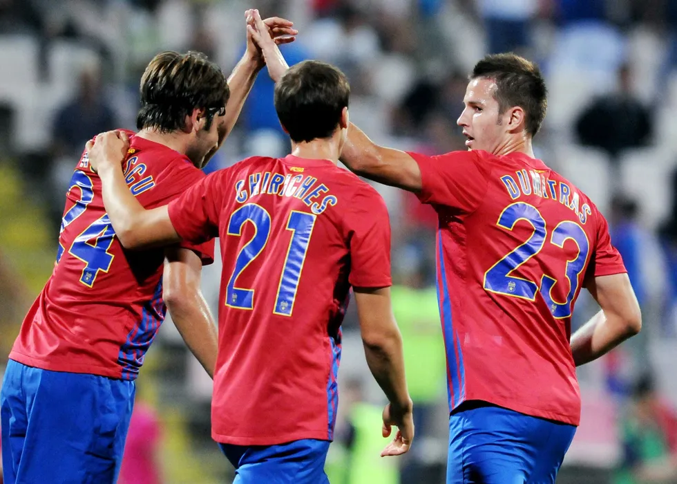 Andrei Dumitras il felicita pe Raul Rusescu dupa golul marcat.