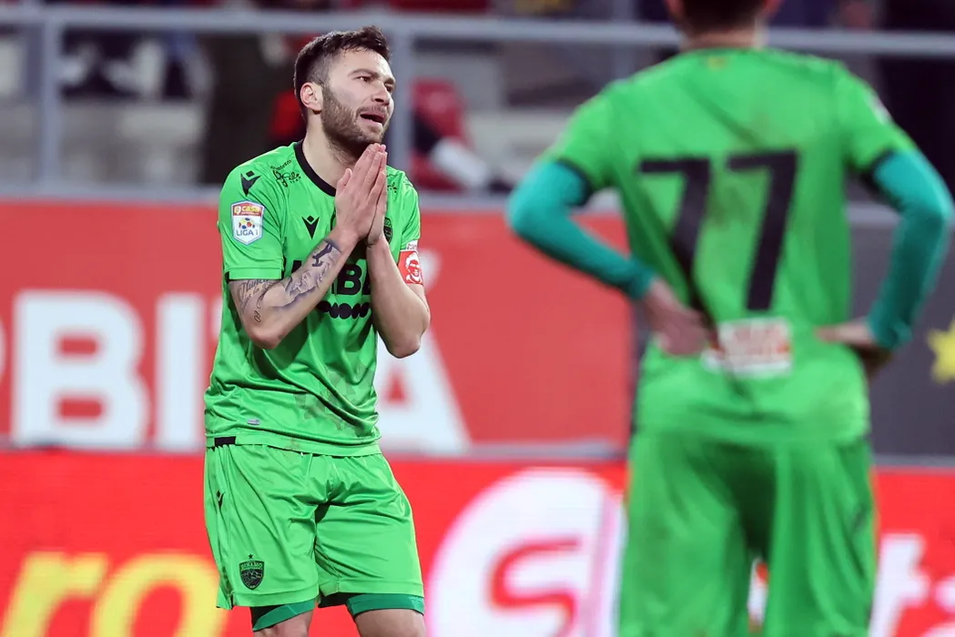 Alexandru Rauta (S), de la Dinamo, reactioneaza in timpul meciului de fotbal contra echipei UTA Arad din etapa a XXVI-a a Ligii 1, disputat pe Arena Francisc Neuman din Arad, duminica, 13 februarie 2022. CIPRIAN PETCUT / MEDIAFAX FOTO