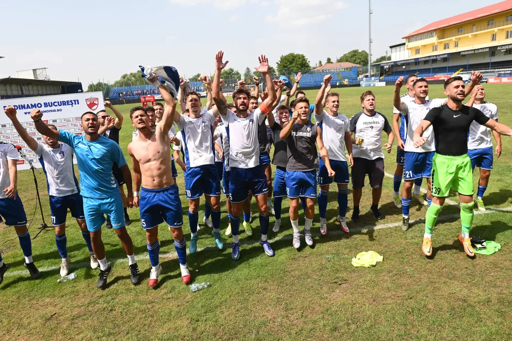 Fotbalistii din Dej Alin Burdet, Florin Blaj, Mihai Kereki, Alex Pop, Daniel Pop si Dorin Railean saluta galeria dupa meciul de fotbal dintre Dinamo Bucuresti si Unirea Dej, contand pentru Liga 2, desfasurat pe Clinceni Arena din Clinceni 2022, sambata 27 august 2022. © FOTO:Razvan Pasarica/SPORT PICTURES