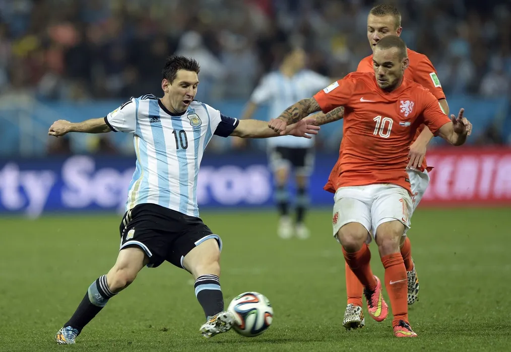Argentina's forward and captain Lionel Messi (L) and Netherlands' midfielder Wesley Sneijder vie for the ball during the first half of extra time during the semi-final football match between Netherlands and Argentina of the FIFA World Cup at The Corinthians Arena in Sao Paulo on July 9, 2014.,Image: 198613604, License: Rights-managed, Restrictions: FOR EDITORIAL REPORTS, NO ALERT/PUSH TO MOBILE, Model Release: no