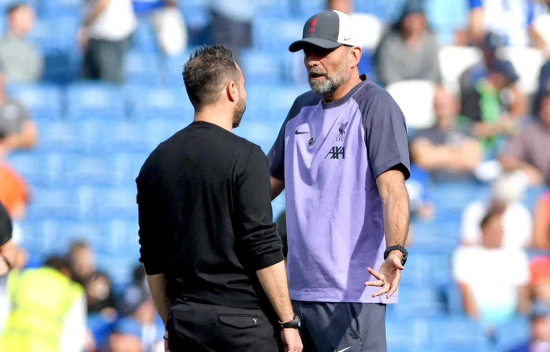 Brighton head coach Roberto De Zerbi and Liverpool manager Jurgen Klopp chatting during the warm up before the Premier League match between Brighton and Hove Albion and Liverpool at the American Express Stadium, Brighton UK - 8th October 2023