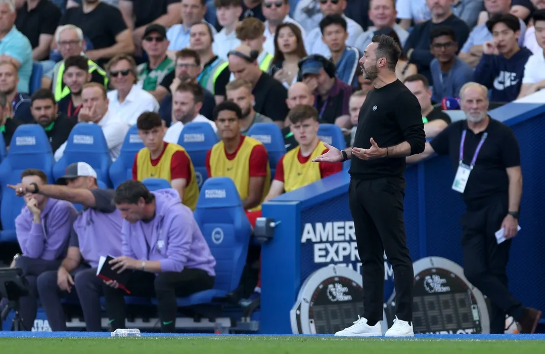 Brighton and Hove Albion manager Roberto De Zerbi on the touchline during the Premier League match at The AMEX, Brighton and Hove. Picture date: Sunday October 8, 2023.,Image: 811991477, License: Rights-managed, Restrictions: EDITORIAL USE ONLY No use with unauthorised audio, video, data, fixture lists, club/league logos or "live" services. Online in-match use limited to 120 images, no video emulation. No use in betting, games or single club/league/player publications., Model Release: no