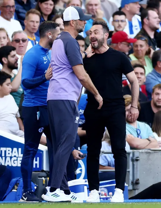 Liverpool Manager Jurgen Klopp attempts to calm down Brighton & Hove Albion Manager Roberto De Zerbi as he shouts at fourth official Graham Scott.