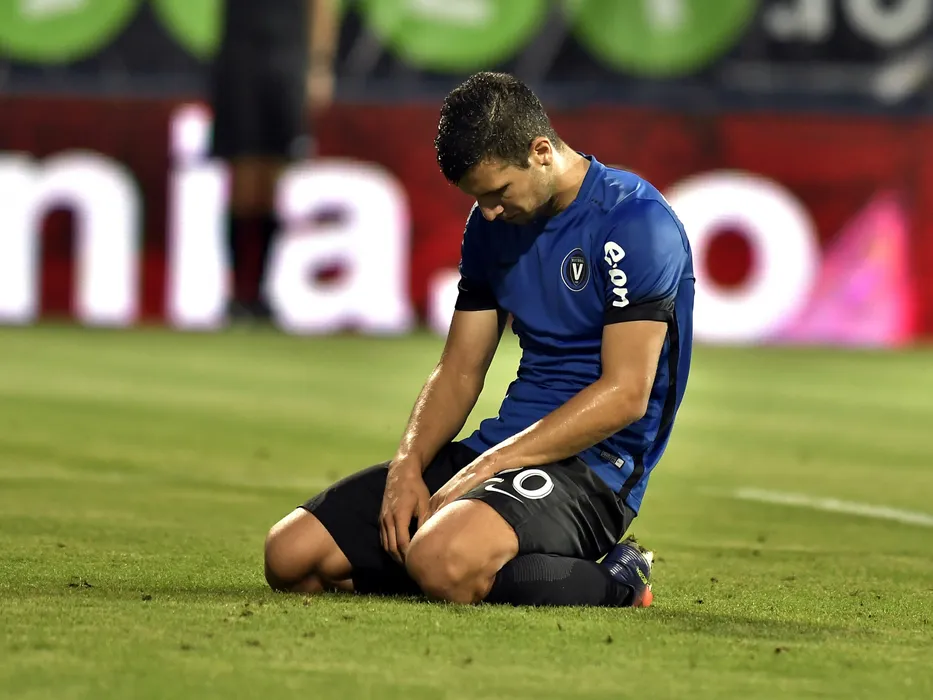 George Tucudean la pamant in meciul de fotbal dintre FC Viitorul Constanta si CS Universitatea Craiova, contand pentru Liga 1 Betano, disputat duminica 20 august 2017 pe stadionul central al academiei Gheorghe Hagi din Ovidiu. Razvan Pasarica/SPORT PICTURES