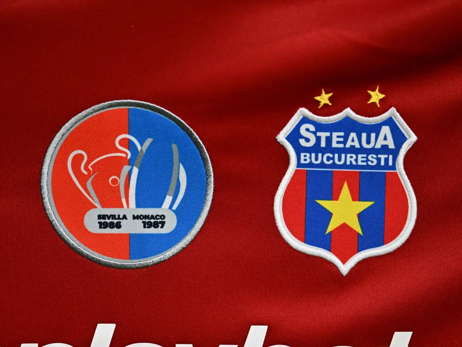 Amanunt vestimentar cu trimitere la finala Cupei Campionilor Europeni din 1986 de la Sevilla si Supercupa Europei de la Monte Carlo din 1987 afisat pe pe tricourile steliste purtate in meciul de fotbal dintre Steaua Bucuresti si Chindia Targoviste, contand pentru Liga a-2-a Casa Pariurilor, desfasurat pe Stadionul Steaua-Ghencea din Bucuresti, marti 26 noiembrie 2024. © FOTO:Razvan Pasarica/SPORT PICTURES