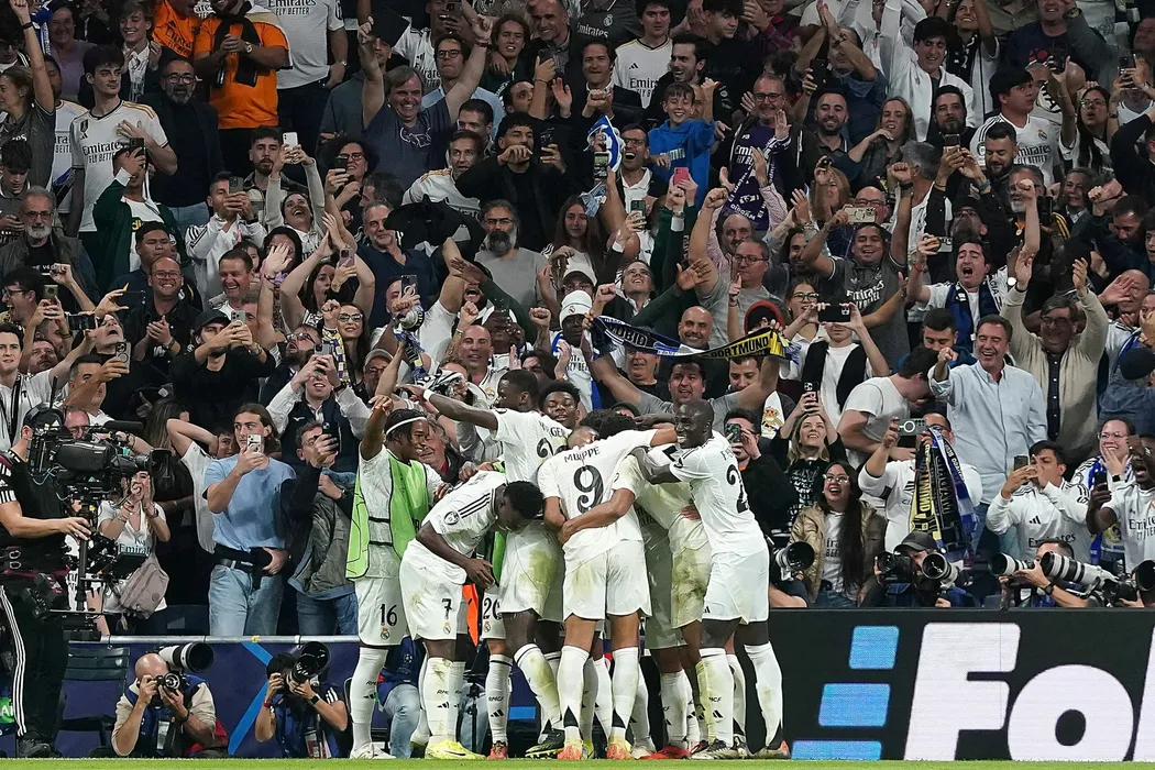 Real Madrid CF's players celebrate goal during Champions League match Real Madrid v Borussia Dortmund on October 22, 2024 in Madrid, Spain. Photo by Acero/AlterPhotos/ABACAPRESS.COM