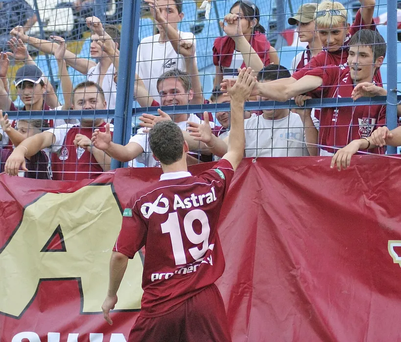 Cosmin Tilinca, jucatorul de la CFR Cluj care a inscris doua goluri in poarta echipei Otelul, este felicitat de suporteri la finalul meciului, duminica 30 iulie 2006, la Galati. Echipa CFR Cluj a invins, duminica, in deplasare, cu scorul de 3-1 (2-0), formatia Otelul Galati, intr-un meci contand pentru prima etapa a editiei 2006/2007 a Ligii I. OVIDIU IORDACHI / MEDIAFAX FOTO