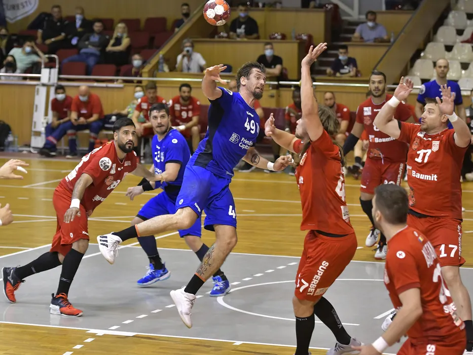 Alireza Mousavi, Nantes Raul Campos si Dan Andrei Savenco in meciul de handbal masculin dintre CSM Bucuresti si Dinamo Bucuresti, contand pentru Cupa Romaniei Fan Courier, desfasurat fara spectatori in Sala Rapid din Bucuresti, joi 27 mai 2021. © FOTO:Razvan Pasarica/SPORT PICTURES