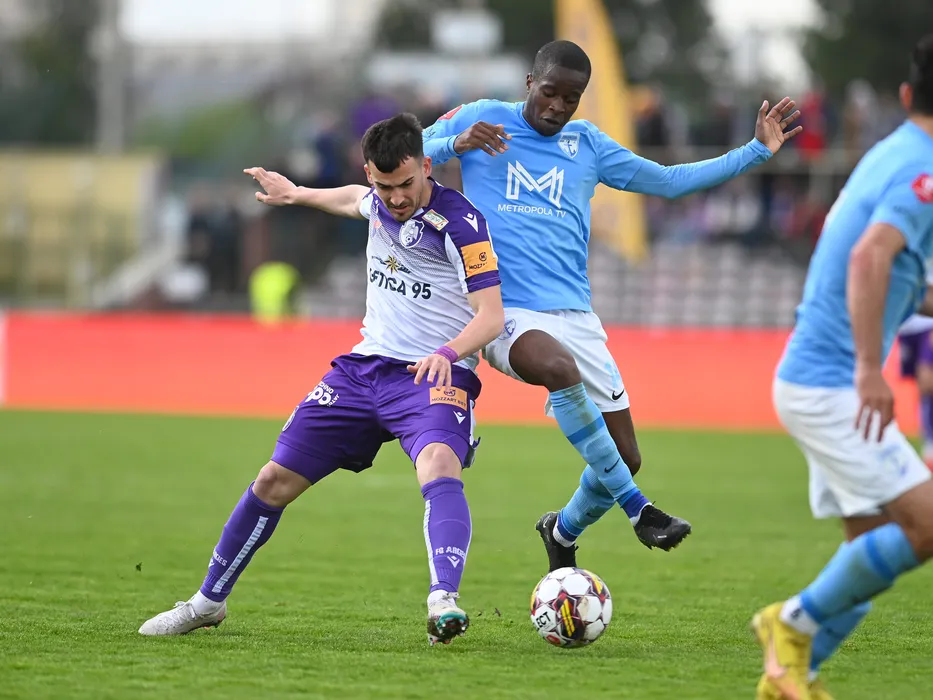 Andrei Costin Tircoveanu si Marcelo Andre Da Veiga Lopes in meciul de fotbal dintre FC Arges si FC Voluntari, contand pentru Play-out-ul Superligii Superbet, desfasurat pe Stadionul Nicolae Dobrin din Pitesti, duminica 2 aprilie 2023. © FOTO:Razvan Pasarica/SPORT PICTURES