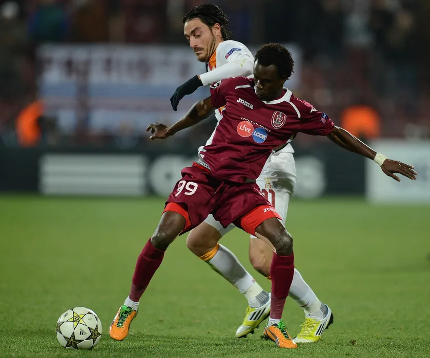 Galatasaray's Spanish midfielder Albert Riera (L) and Cluj's Senegalese forward Modou Sougou vie for the ball during the UEFA Champions League Group H football match CFR Cluj vs Galatasaray AS in Cluj-Napoca, Romania on November 7, 2012. Galatasaray won the match 1-3.,Image: 145712880, License: Rights-managed, Restrictions: , Model Release: no, Credit line: DANIEL MIHAILESCU / AFP / Profimedia