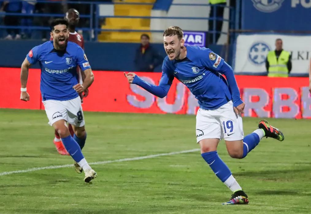 Luca Cristian Andronache după un gol marcat în meciul de fotbal dintre FC Farul Constanța si FC Rapid 1923 București, contând pentru Superliga Superbet Play-Off, desfășurat pe Stadionul central al Academiei Gheorghe Hagi din Ovidiu, miercuri 24 aprilie 2024. © FOTO: Sorin DANIELCIUC/SPORT PICTURES