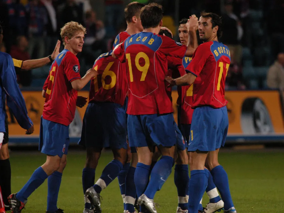 Bucurie stelista cu Mihai Nesu, George Ogararu si Gabriel Bostina la meciul de fotbal dintre Valerenga FC si Steaua Bucuresti, contand pentru Cupa UEFA, disputat pe Stadionul Ullevaal din Oslo, miercuri 14 septembrie 2005. © FOTO:Razvan Pasarica/SPORT PICTURES