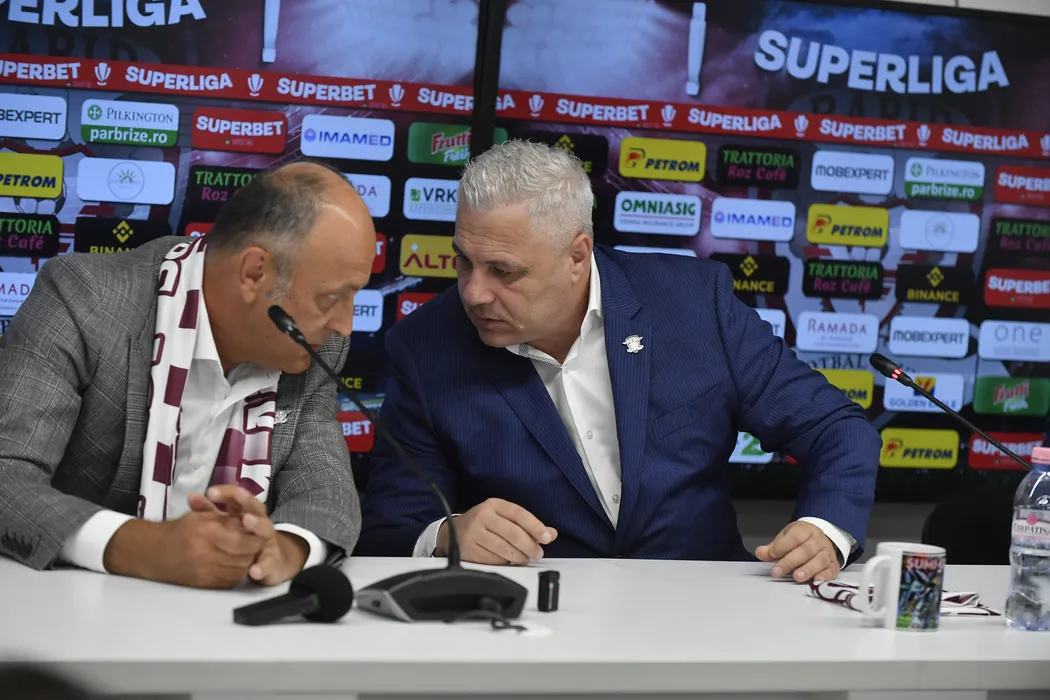 Dan Șucu și Marius Șumudică participă participă la o conferință de presă desfășurată la Clubul Rapid din București, miercuri 21 august 2024. © FOTO: Simion MECHNO/SPORT PICTURES