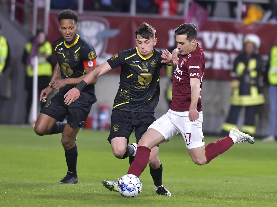 Felix Mathaus Lima Santos si Stefan Calin Panoiu in meciul de fotbal dintre Rapid Bucuresti si Gaz Metan Medias, contand pentru Play out-ul Ligii 1 Casa Pariurilor, desfasurat pe Stadionul Rapid-Giulesti din Bucuresti, luni 18 aprilie 2022. © FOTO:Razvan Pasarica/SPORT PICTURES