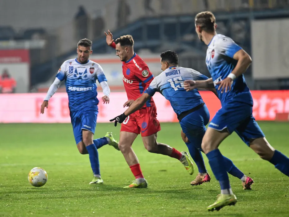 Dennis Dorin Politic si Alin Burdet in meciul de fotbal dintre Gloria Bistrita si FCSB, din cadrul Cupei Romaniei Betano, desfasurat pe Stadionul Jean Padureanu din Bistrita, miercuri 29 octombrie 2025. © FOTO:Razvan Pasarica/SPORT PICTURES