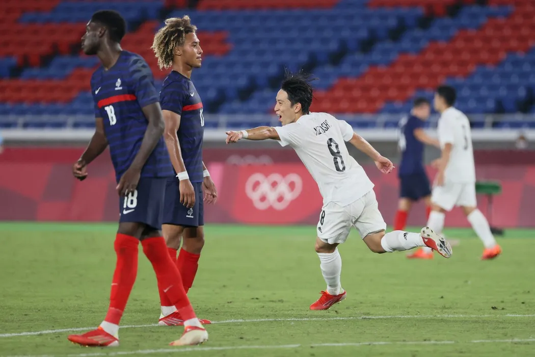 Japan's midfielder Koji Miyoshi (R) celebrates scoring his team's third goal during the Tokyo 2020 Olympic Games men's group A first round football match between France and Japan at the Yokohama International Stadium in Yokohama on July 28, 2021.,Image: 623889056, License: Rights-managed, Restrictions: , Model Release: no, Credit line: Profimedia