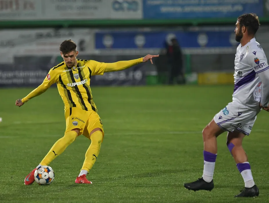 Iulius Andrei Marginean si Roberto Manuel Sierra Gimenez in meciul de fotbal dintre FC Arges si Dinamo Bucuresti, contand pentru Superliga Superbet, desfasurat pe Stadionul Orasenesc din Mioveni, vineri 24 octombrie 2025. © FOTO:Mihai Nitoiu/SPORT PICTURES