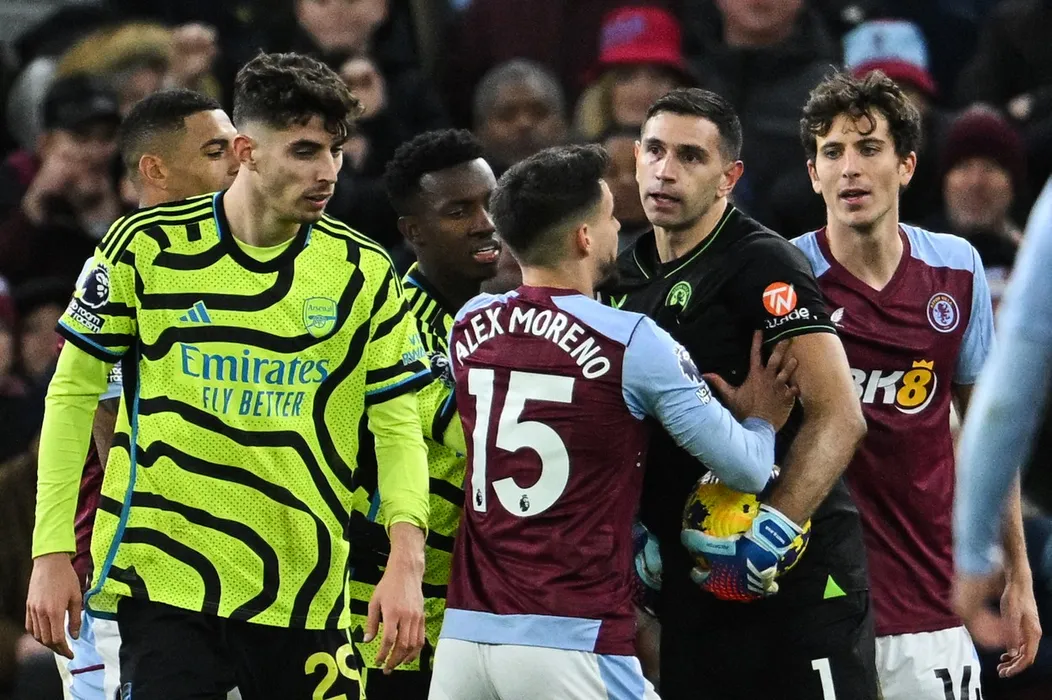 Aston Villa's Argentinian goalkeeper #01 Emiliano Martinez reacts after arguing with Arsenal's German midfielder #29 Kai Havertz during the English Premier League football match between Aston Villa and Arsenal at Villa Park in Birmingham, central England on December 9, 2023.,Image: 828161358, License: Rights-managed, Restrictions: RESTRICTED TO EDITORIAL USE. No use with unauthorized audio, video, data, fixture lists, club/league logos or 'live' services. Online in-match use limited to 120 images. An additional 40 images may be used in extra time. No video emulation. Social media in-match use limited to 120 images. An additional 40 images may be used in extra time. No use in betting publications, games or single club/league/player publications., Model Release: no
